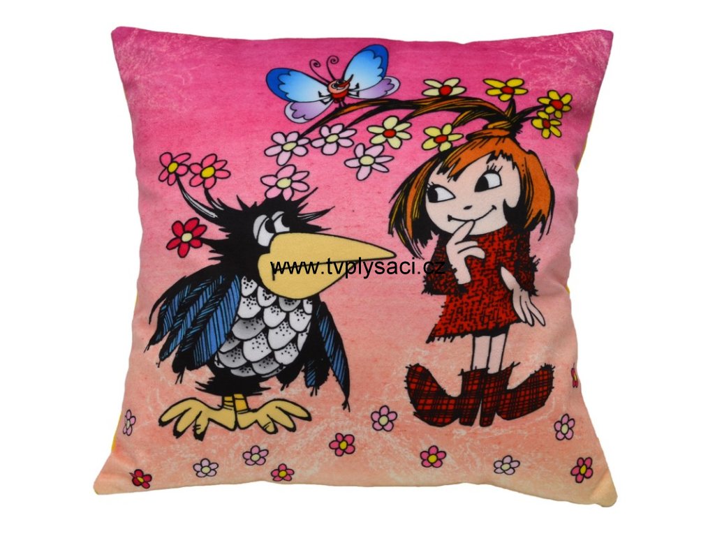 A soft pillow with a motif of the Little Witch and her raven friend, suitable for the crib, for travel and as a decoration for the room. Microvelour material, printed image, hollow fiber filling, yellow back. Washable.
