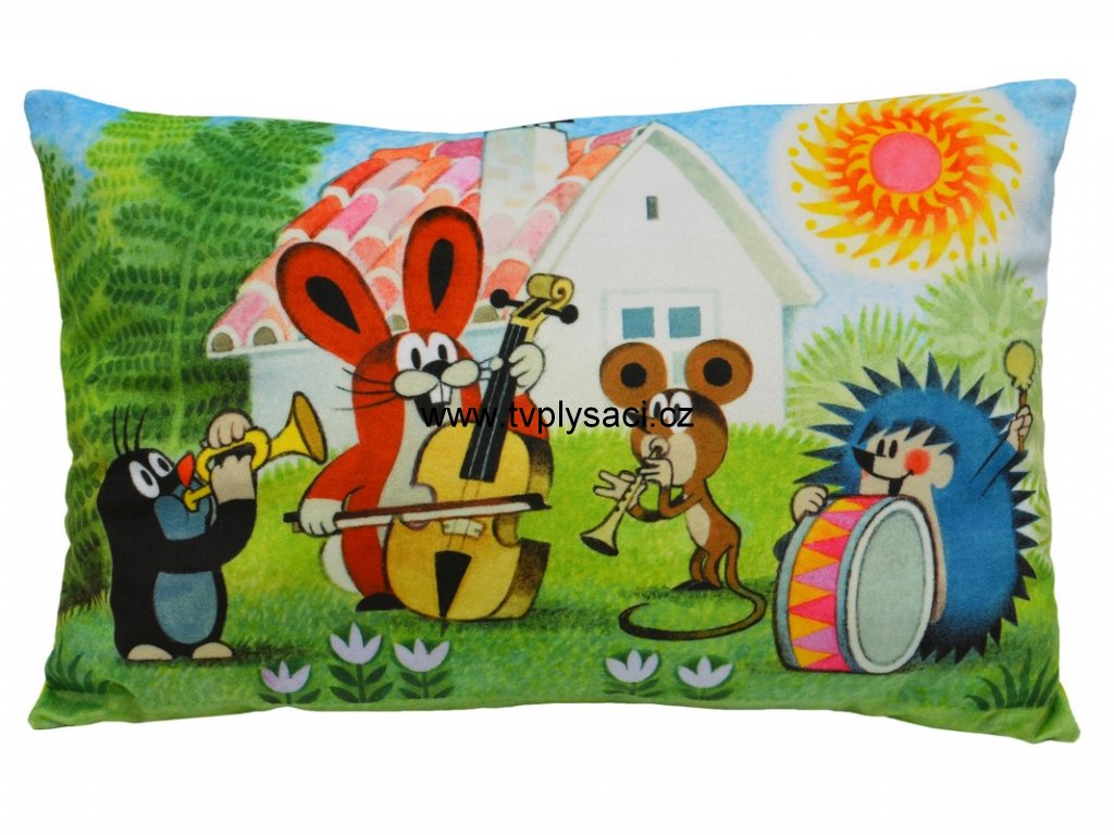A soft pillow with a motif of the popular Mole, suitable for the crib, for travel and as a decoration for the room. Microvelour material, printed image, hollow fiber filling. Yellow-green back. Washable.